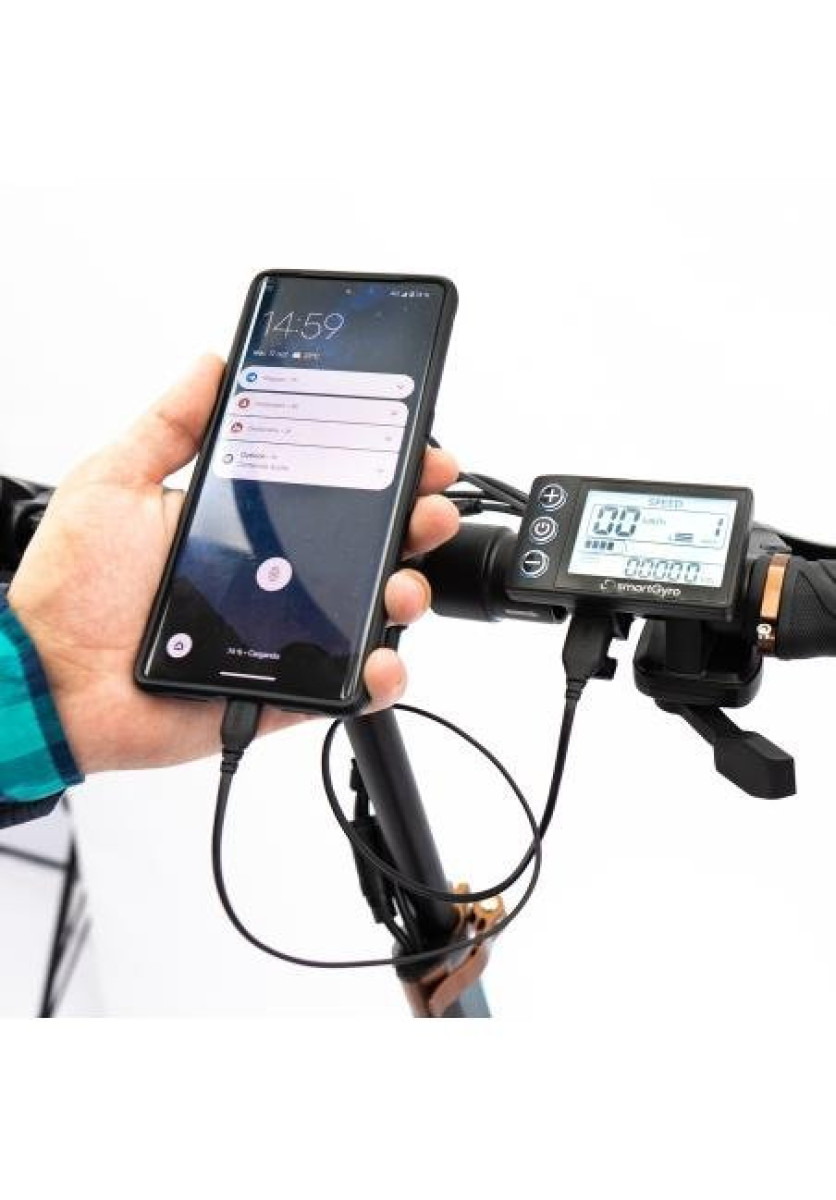 - Display frontal con toma USB de carga (cuentakilómetros parcial y total, marchas, indicador de velocidad, etc...)